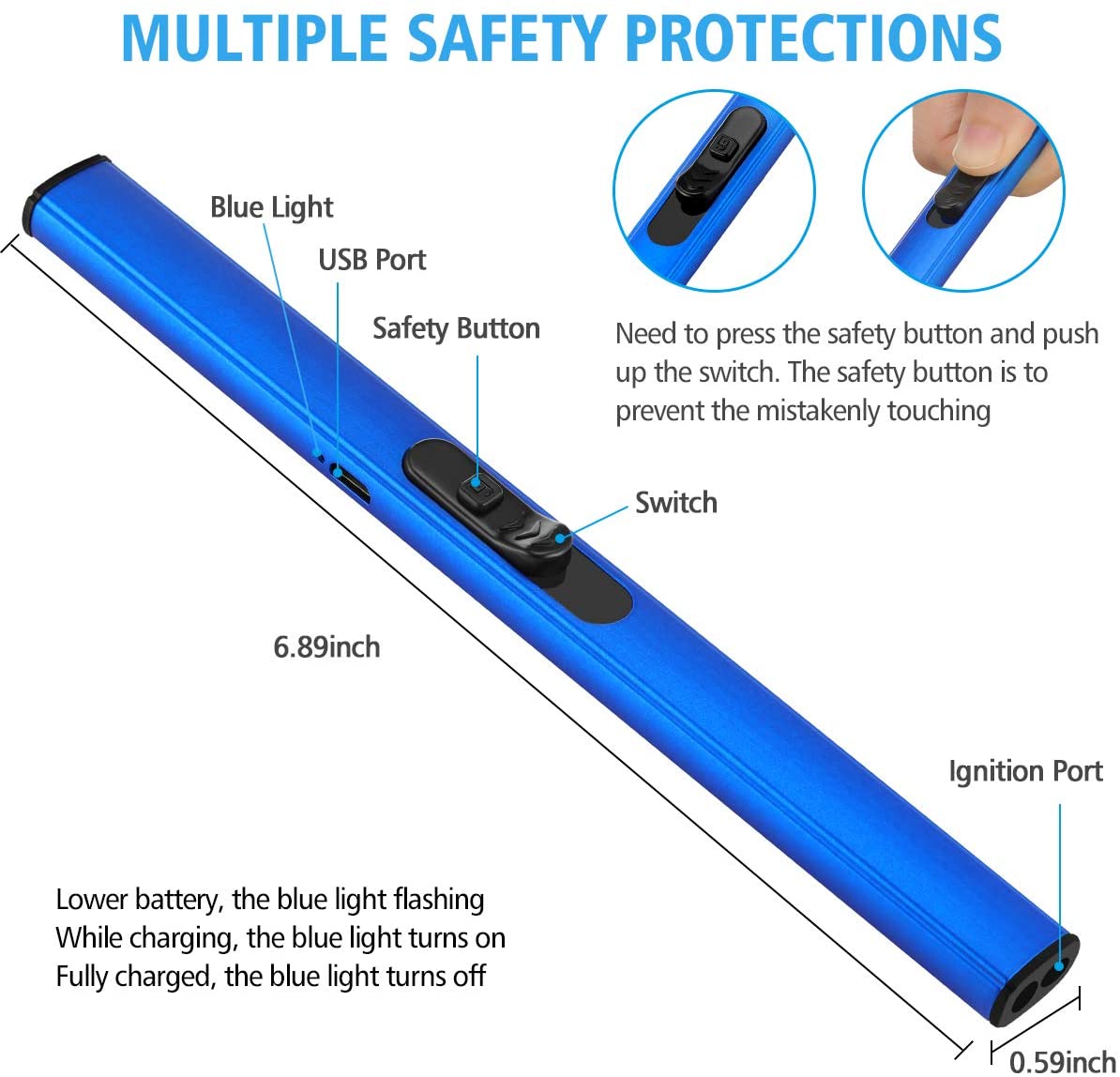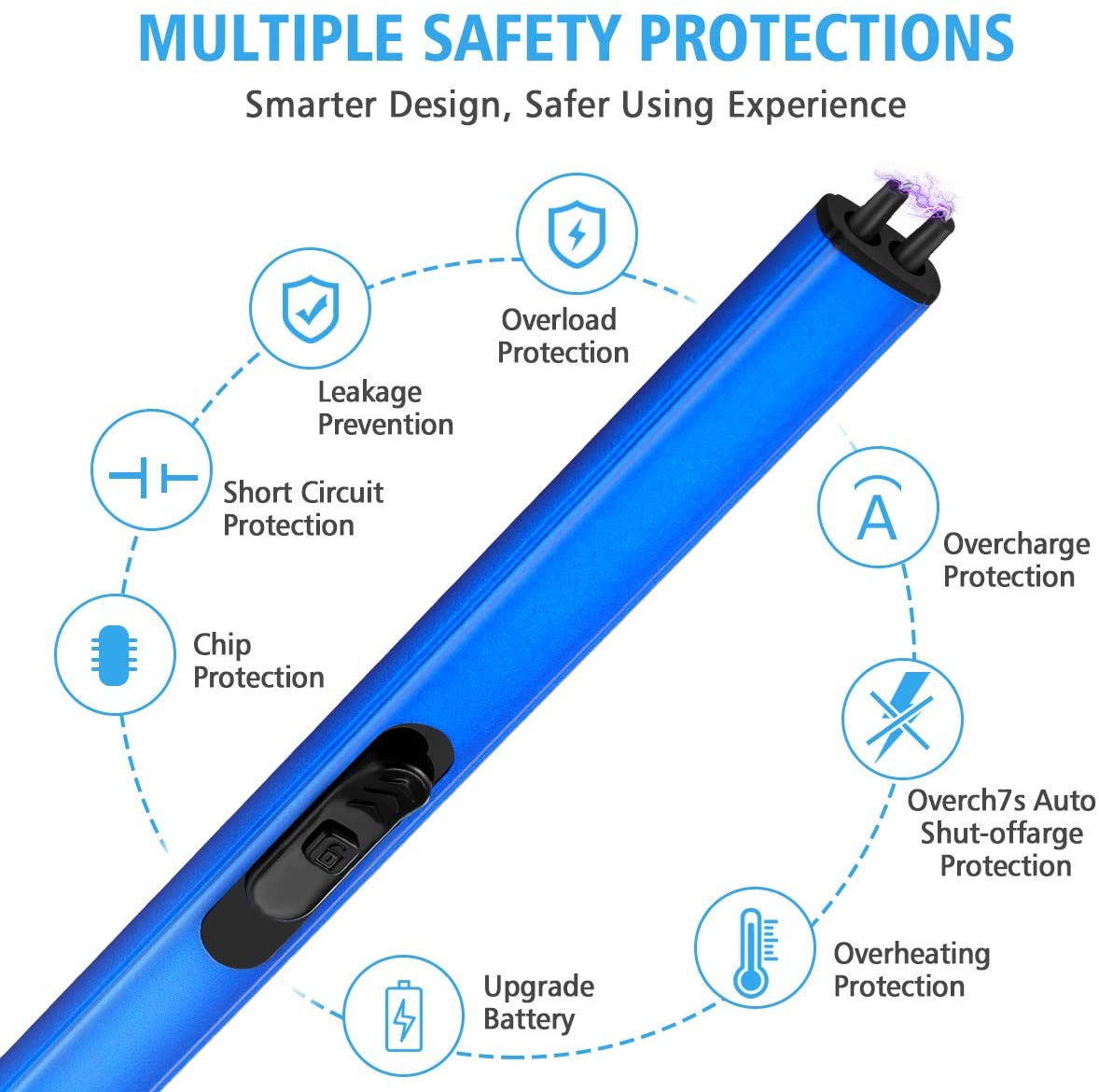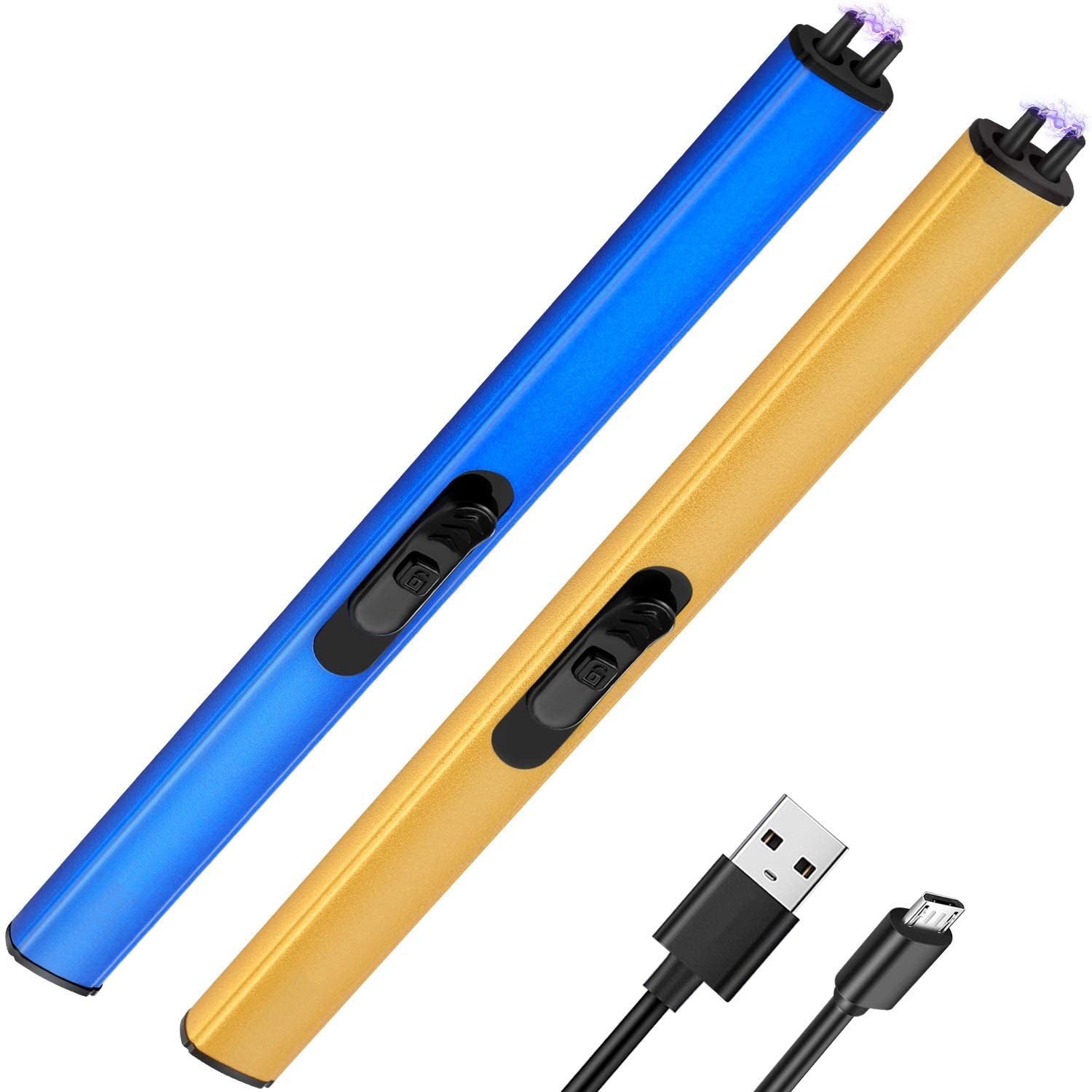 • TREBLE SAFETY DESIGN - Our rechargeable candle lighter gives you treble protection, you need to press the safety button and push up the switch to ignite the lighter. For the safety of consumers, the igniting spark will auto stop beyond 7 seconds per igniting. Restart the switch, the igniting spark will be re-ignited. Please press the safety button and push up the switch gently while using it.