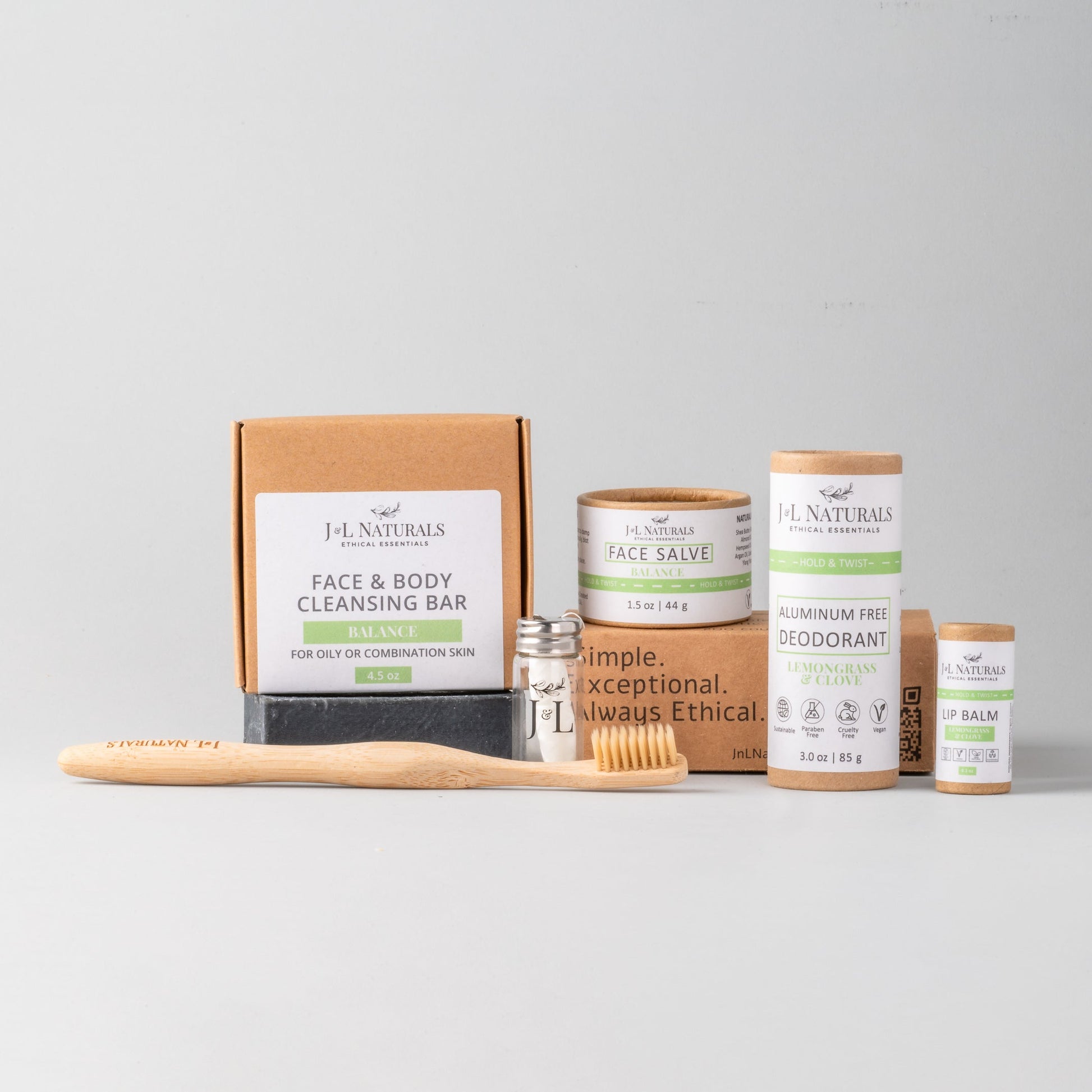 Includes: (1) Cleansing Bar, (1) Face Salve, (1) Lip Balm, (1) Deodorant, (1) Bamboo Toothbrush, (1) Floss, (1) Set of Cotton Buds